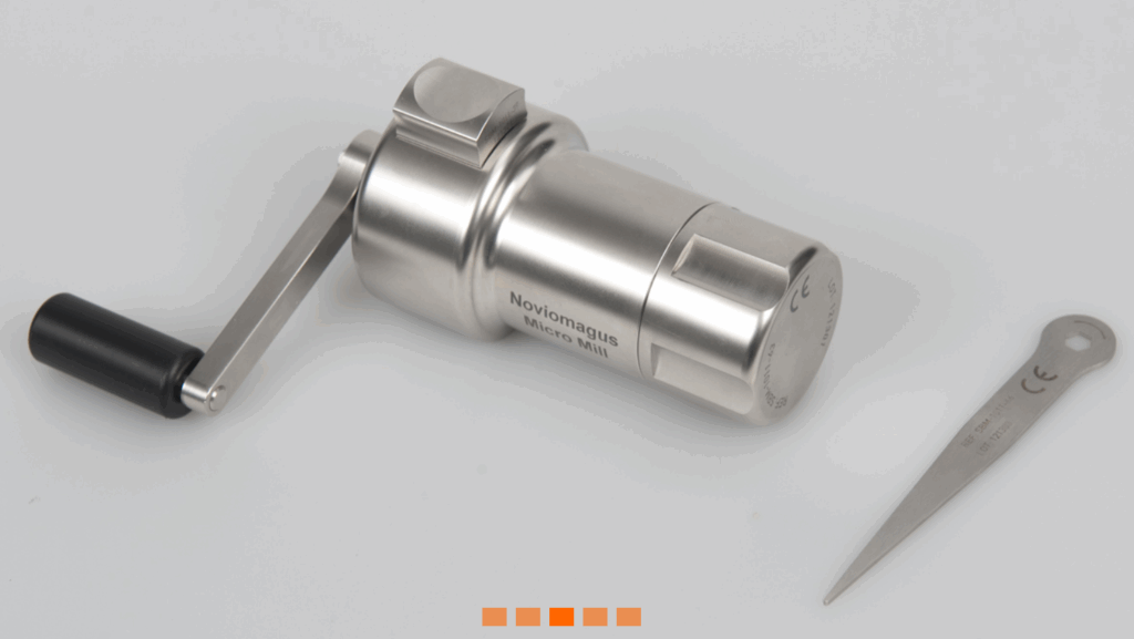 De Noviomagus Micro Mill vermaalt kleine botdeeltjes tot zeer kleine botpartikels (0.5 – 2 mm), ten behoeve van een benodigde bot “graft”.