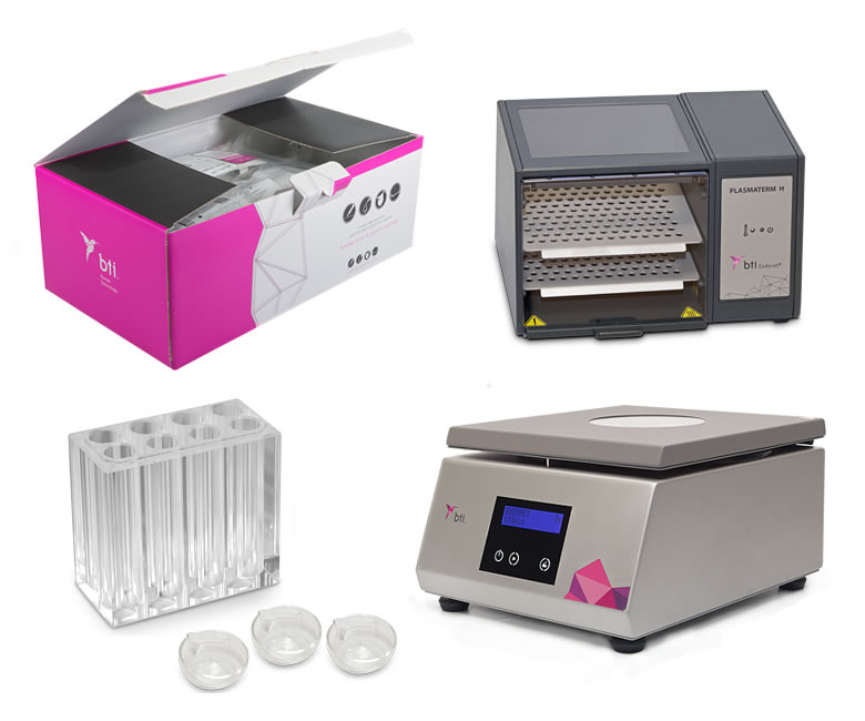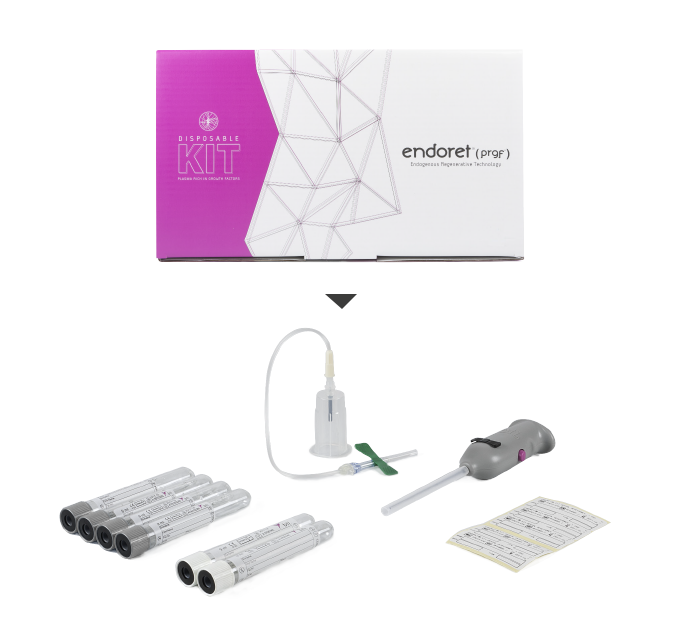 Endoret® (PRGF) valt onder de categorie die gebruik maakt van wegwerpkits, dat wil zeggen de “gesloten techniek”. De kit bevat alle elementen die nodig zijn voor het verkrijgen van plasma dat rijk is aan formuleringen van groeifactoren, zonder dat externe elementen nodig zijn.